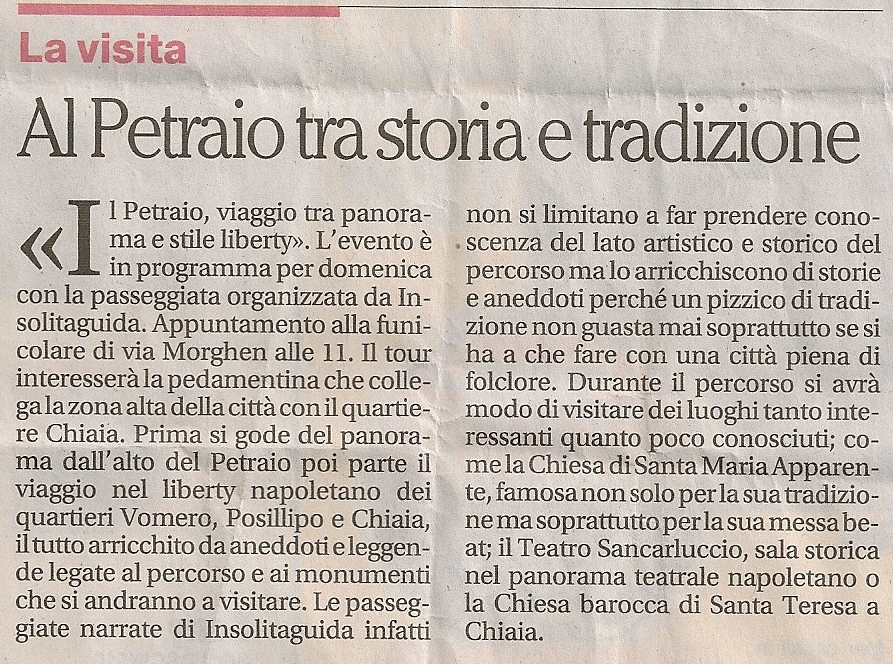 L'evento è in programma per domenica con la passeggiata organizzata da Insolitaguida. Appuntamento alla funicolare di via Morghen alle 11. Il tour interesserà la pedamentina che collega la zona alta della città con il quartiere Chiaia. Prima si gode del panorama dall'alto del Petraio poi parte il viaggio nel liberty napoletano dei quartieri Vomero, Posillipo e Chiaia, il tutto arricchito da aneddoti e leggende legate al percorso e ai monumenti che si andranno a visitare. Le passeggiate narrate di Insolitaguida, infatti non si limitano a far prendere conoscenza del lato artistico e storico del percorso ma lo arricchiscono di storie e aneddoti perché un pizzico di tradizione non guasta mai soprattutto se si ha a che fare con una città piena di folclore. Durante il percorso si avrà modo di visitare dei luoghi tanto interessanti quanto poco conosciuti; come la Chiesa di Santa Maria Apparente, famosa non solo perla sua tradizione ma soprattutto perla sua messa beat; il Teatro Sancarluccio, sala storica nel panorama teatrale napoletano o la Chiesa barocca di Santa Teresa a Chiaia.