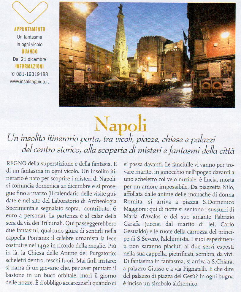 Regno della superstizione e della fantasia. E di un fantasma in ogni vicolo. Un insolito itinerario è nato per scoprire i misteri di Napoli: si comincia domenica 21 dicembre e si prosegue fino a marzo (il calendario delle visite guidate è nel sito del Laboratorio di Archeologia Sperimentale segnalato sopra, contributo: 6 euro a persona). La partenza è al calar della sera da via dei Tribunali. Qui passeggerebbero due fantasmi, qualcuno giura di sentirli nella cappella Pontano: il celebre umanista la fece costruire nel 1492 in ricordo della moglie. Più in là, la Chiesa delle Anime del Purgatorio: scheletri dentro, teschi fuori. Mai farli irritare: si narra di un giovane che, per aver puntato il bastone in un buco orbitale, morì il giorno delle nozze. È d’obbligo accarezzarli quando ci si passa davanti. Le fanciulle vi vanno per trovare marito, in ginocchio nell’ipogeo davanti a uno scheletro col velo nuziale: è Lucia, morta per un amore impossibile. Da piazzetta Nilo, affollata dalle anime delle monache di donna Romita, si arriva a piazza S.Domenico Maggiore: qui di notte si sentono i sussurri di Maria d’Avalos e del suo amante Fabrizio Carafa (uccisi dal marito di lei, Carlo Gesualdo) e le ruote della carrozza del principe di S.Severo, l’alchimista. I suoi esperimenti non saranno piaciuti ai due servi esposti nella sua cappella, pietrificati, sembra, da vivi. Di fantasma in fantasma, si arriva a S.Chiara, a palazzo Giusso e a via Pigliatelii. E che dire del palazzo di piazza del Gesù? In ogni bugna è inciso un simbolo alchemico.