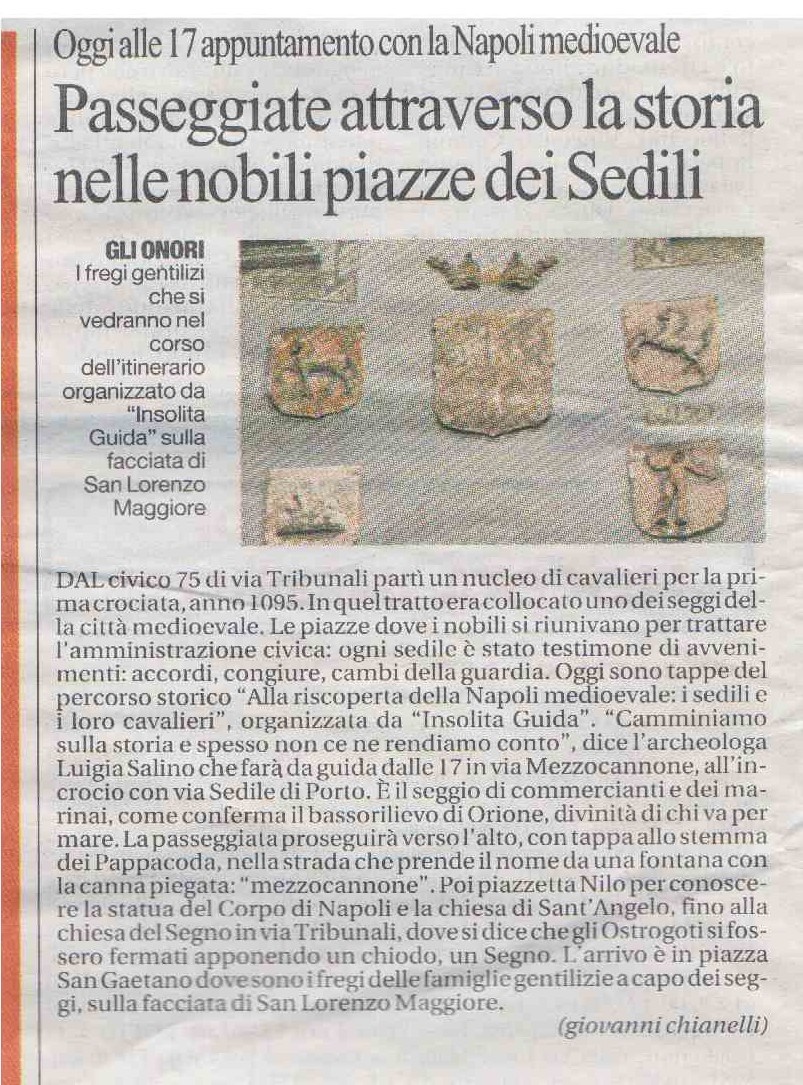 Dal civico 75 di via Tribunali parti un nucleo di cavalieri per la prima crociata, anno 1095. In quel tratto era collocato uno dei seggi della città medioevale. Le piazze dove i nobili si riunivano per trattare l'amministrazione civica: ogni sedile è stato testimone di avvenimenti: accordi, congiure, cambi della guardia. Oggi sono tappe del percorso storico “Alla riscoperta della Napoli medioevale: i sedili e i loro cavalieri”, organizzata da “Insolita Guida". “Camminiamo sulla storia e spesso non ce ne rendiamo conto", dice l’archeologa Luigia Salino che farà da guida dalle 17 in via Mezzocannone, all’incrocio con via Sedile di Porto. È il seggio di commercianti e dei marinai, come conferma il bassorilievo di Orione, divinità di chi va per mare. La passeggiala proseguirà verso l'alto, con tappa allo stemma dei Pappacoda, nella strada che prende il nome da una fontana con la canna piegata: "mezzocannone”. Poi piazzetta Nilo per conoscere la statua del Corpo di Napoli e la chiesa di Sant’Angelo, fino alla Chiesa del Segno in via Tribunali, dove si dice che gli Ostrogoti si fossero fermati apponendo un chiodo, un Segno. L'arrivo è in piazza San Gaetano dove sono i fregi delle famiglie gentilizie a capo dei seggi. sulla facciata di San Lorenzo Maggiore.