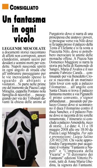 Leggende mescolate a a documenti storici raccontano di affetti non corrisposti, amori clandestini, amanti uccisi per desideri e uomini morti per vendette. Napoli nasconde spiriti in ogni angolo di strada che all'imbrunire passeggiano per le vie incrociando spesso lo sguardo di abitanti e visitatori...Si parte nelle prime ore del tramonto da Piazza Luigi Miraglia, cappella Pontano nota famiglia di necrofori ... passeggiando per via dei Tribunali davanti la chiesa delle anime al Purgatorio dove si narra di una principessa che aiutava i poveri, si prosegue verso via Nilo dove si fa tappa presso il palazzo della Testa d Elefante e si fa sosta a Piazzetta Nilo, dove si potrebbero incrociare le anime delle monache offese. A Piazza San Domenico Maggiore si narra la storia più bella di Raimondo di Sangro. Maria d’Avalos e il suo amante Fabrizio Carafa... continuando per via Benedetto Croce si racconta di un marinaio latin lover con sede a palazzo Filomarino... all'angolo con Santa Chiara si trova il palazzo fantasma mentre a via Pignatelli il primo convento, o’signor abbandunat... passando per palazzo Giusso dove si scontrarono il duca Filomarino contro il duca Sanchez. e il palazzo Penne dove si racconta di tre sorelle innamorate, l'itinerario si conclude a palazzo Amendola, ricco di storie... Le date: 4. Il e 18 maggio 2008 alle ore 18.00 da Piazza Luigi Miraglia. Per info e prenotazioni: Luigia Salmo 338 9652288.
