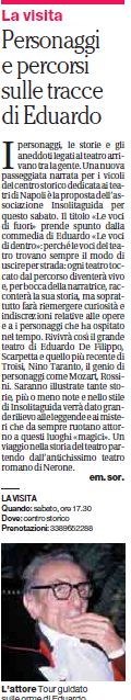 I personaggi, le storie e gli aneddoti legati al teatro arrivano tra la gente. Una nuova passeggiata narrata per i vicoli del centro storico dedicata ai teatri di Napoli è la proposta dell'associazione Insolitaguida per questo sabato. Il titolo -Le voci di fuori - prende spunto dalla commedia di Eduardo -le voci di dentro- : perche le voci dei teatro trovano sempre il modo di uscire per strada: ogni teatro toccato dal percorso diventerà vivo e, per bocca della narratrice, racconterà la sua storia, ma soprattutto farà riemergere curiosità e indiscrezioni relative alle opere e a i personaggi che ha ospitato nel tempo. Rivivrà cosi il grande teatro di Eduardo De Filippo, Scarpetta e quello più recente di Troisi, Nino Taranto, il genio di personaggi come Mozart, Rossini. Saranno illustrate tante storie più o meno note e nello stile di Insolitaguida verrà dato grande rilievo alle leggende e ai misteri che da sempre ruotano attorno a questi luoghi magici. Un viaggio nella storia del teatro partendo dall'antichissimo teatro romano di Nerone.