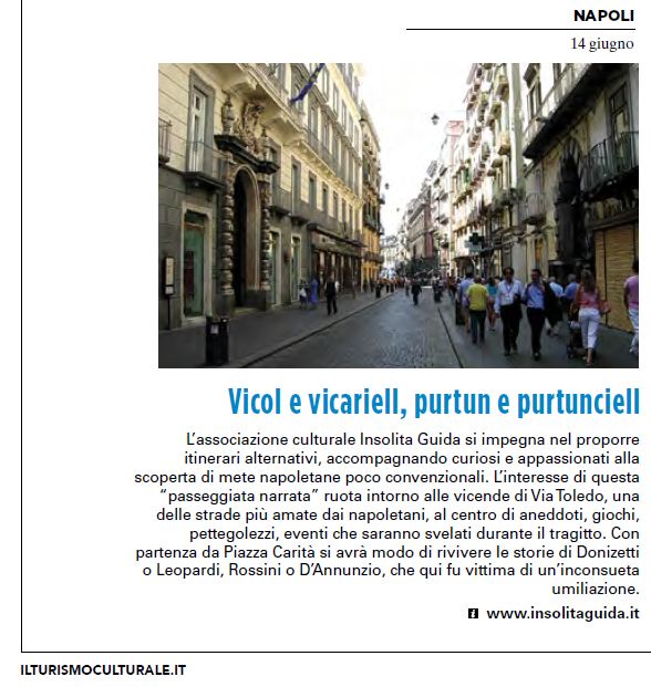 L'associazione culturale InsolitaGuida si impegna nel proporre itinerari alternativi, accompagnando curiosi e appassionati alla scoperta di mete napoletane poco convenzionali. L'interesse di questa "passeggiata narrata" ruota intorno alle vicende di ViaToledo, una delle strade più amate dai napoletani, al centro di aneddoti, giochi,pettegolezzi, eventi che saranno svelati durante il tragitto. Con partenza da Piazza Carità si avrà modo di rivivere le storie di Donizetti o Leopardi, Rossini o D'Annunzio, che qui fu vittima di un'inconsueta umiliazione.